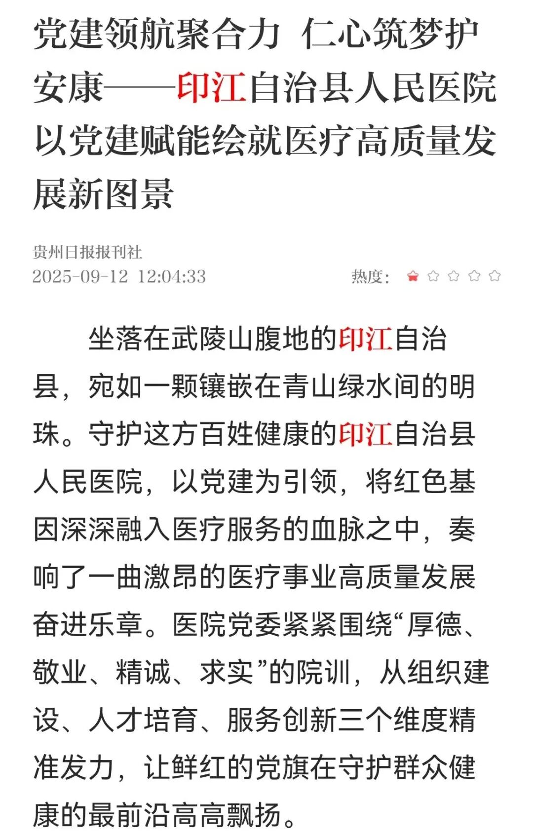 ▲9月12日,天眼新闻报道 党建领航聚合力 心梦护安康—印江自治县人民医院以党建赋能绘就医疗高质量发展新图景