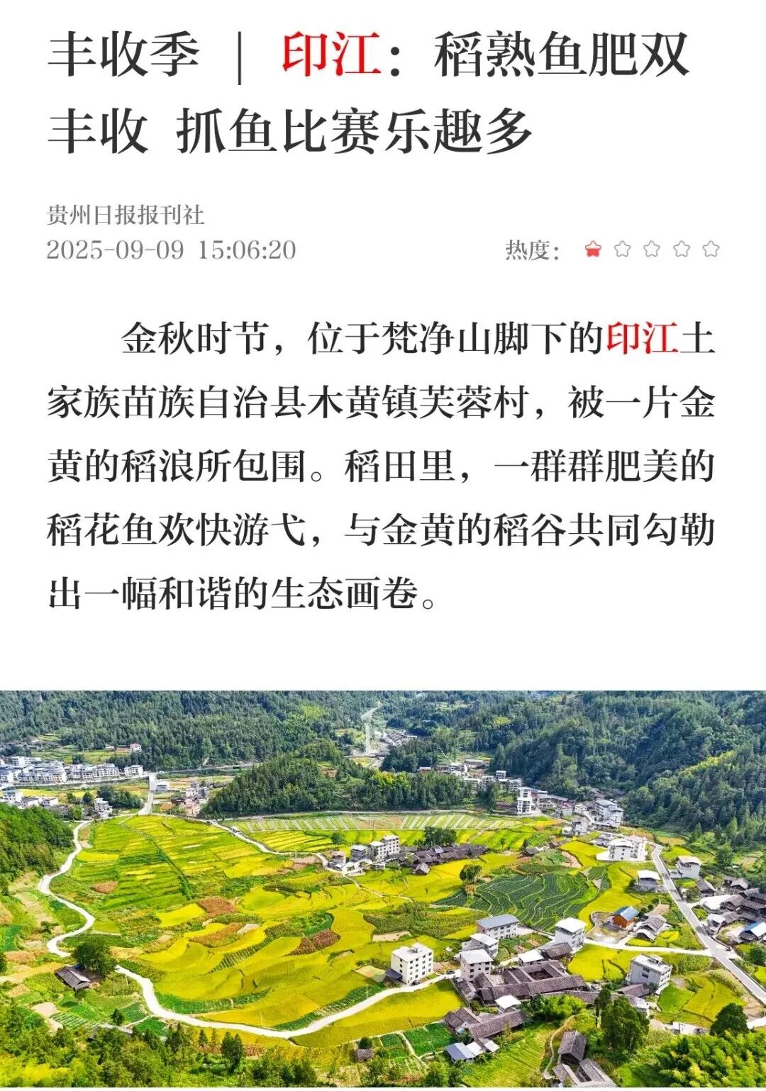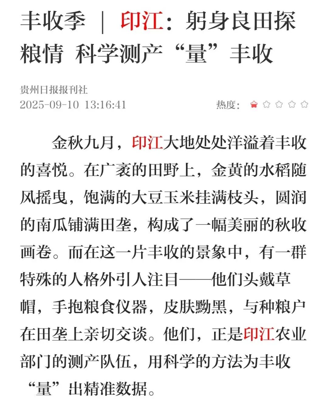 ▲9月12日,《铜仁日报》报道 印江:躬身良田探粮情 科学测产“量”丰收