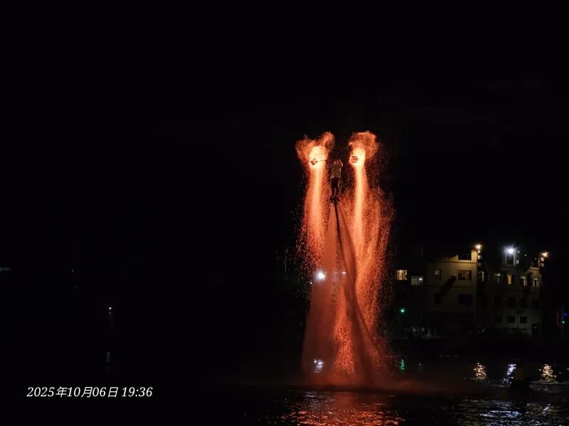 夜幕降临,云上天池湖畔早已人头攒动。随着光影亮起,水上火壶表演如期登场:表演者脚踏喷射式悬浮飞行器,在湖面灵活盘旋、跳跃,手中特制火壶经奋力抖动,瞬间绽放出万千星火,熊熊火光与月光在水面交织成璀璨光影,“火树银花不夜天”的盛景引得观众阵阵欢呼。