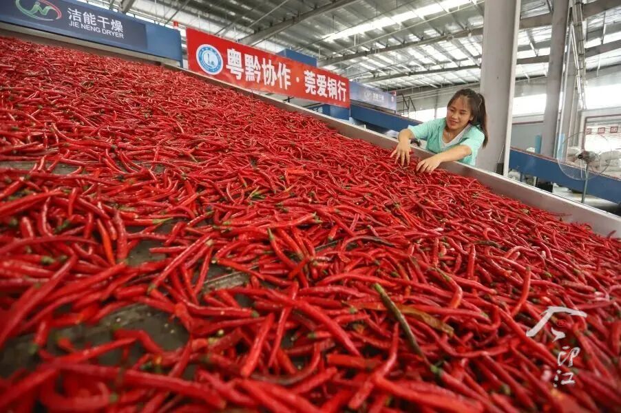 为解决辣椒销路问题,莞印两地积极搭建市场对接平台,推动印江辣椒“走出去”。“现在我们的辣椒不仅在本地销售,还卖到全国各地,价格有保障,销路也稳定。”贵州梵净红食品有限公司副总经理张元吉介绍。2021年,借助东西部协作资金,印江启动了5万亩辣椒种植及精深加工项目,新建烘干车间、泡椒车间、糟辣椒车间,5条生产线同时投产,日烘干鲜椒200吨,并创建梵净红辣椒品牌,涵盖干辣椒、油辣椒、泡椒、糟辣椒等多种辣椒制品;2023年,依托省级资金和东西部协作资金,完善了贵州梵净红食品有限公司的精深加工厂房、冷库等基础设施,开发出辣椒面、辣椒粉等系列产品,实现了辣椒产业全产业链发展。