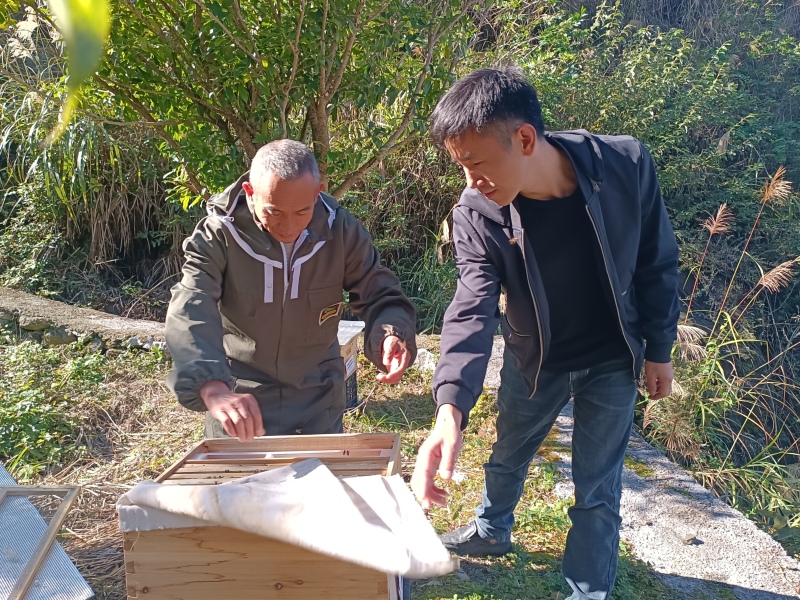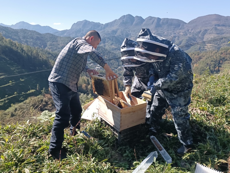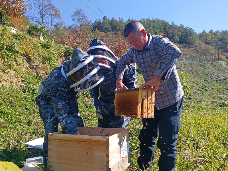 初冬时节,走进贵州省缠溪镇缠溪村、双龙村中蜂养殖基地,一排排整齐的蜂箱在山间错落分布,蜂农们正忙着检查蜂箱、清理杂物,为蜜蜂越冬做准备。