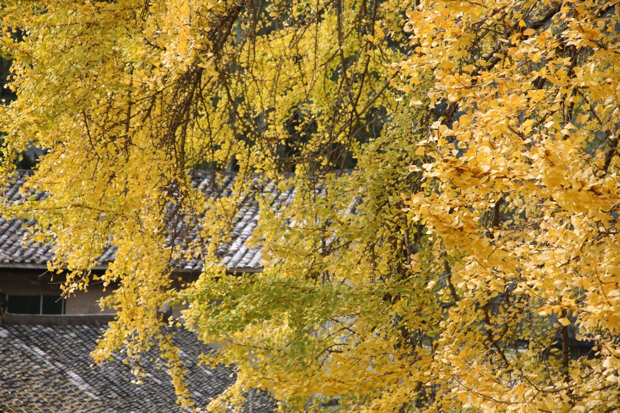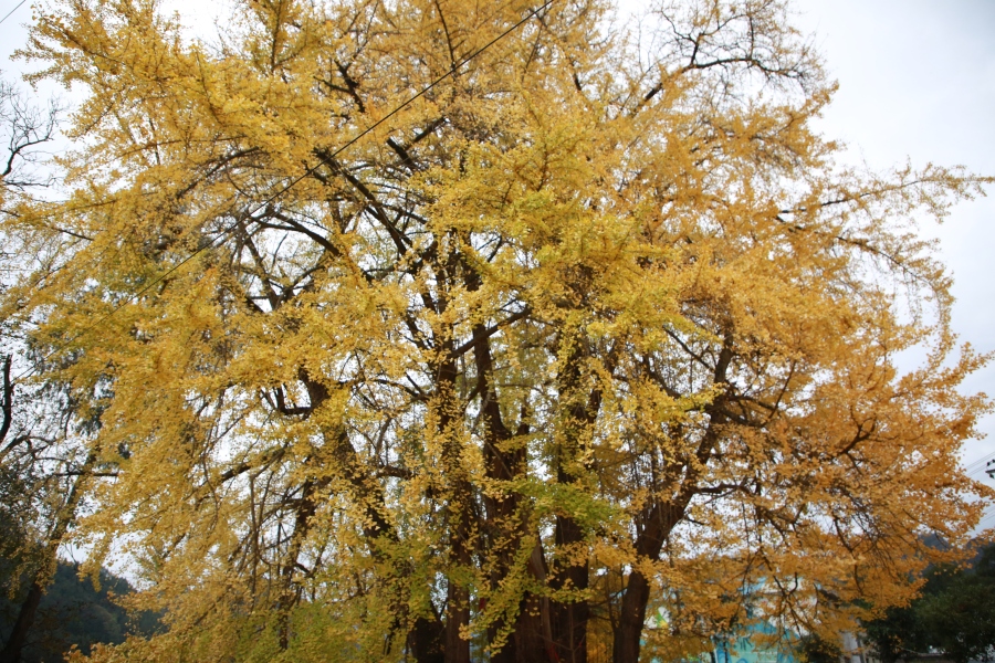 沿着小吃摊往里走,只见这棵千年银杏越发夺目:需四五人合抱的树干纹路沟壑纵横,枝丫如伞盖舒展开来,金黄叶片在阳光下熠熠生辉。