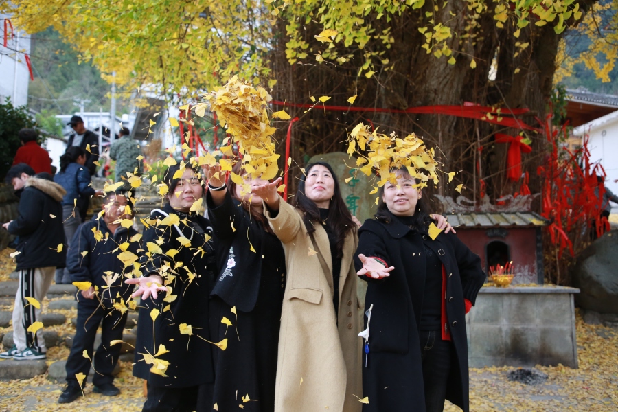 “快看,这片叶子像小扇子一样,落在头发上真好看!”11月22日,印江自治县木黄镇凤仪村的千年银杏树下,来自重庆秀山的游客李艳正举着相机,记录女儿与金黄落叶相拥的瞬间。这棵树龄超千年的古银杏在冬日里褪去绿装换“金装”,连同进村公路上的车流、路口香气扑鼻的特色小吃摊,让这里成了省内外游客争相打卡的网红地,促进了乡村旅游。
