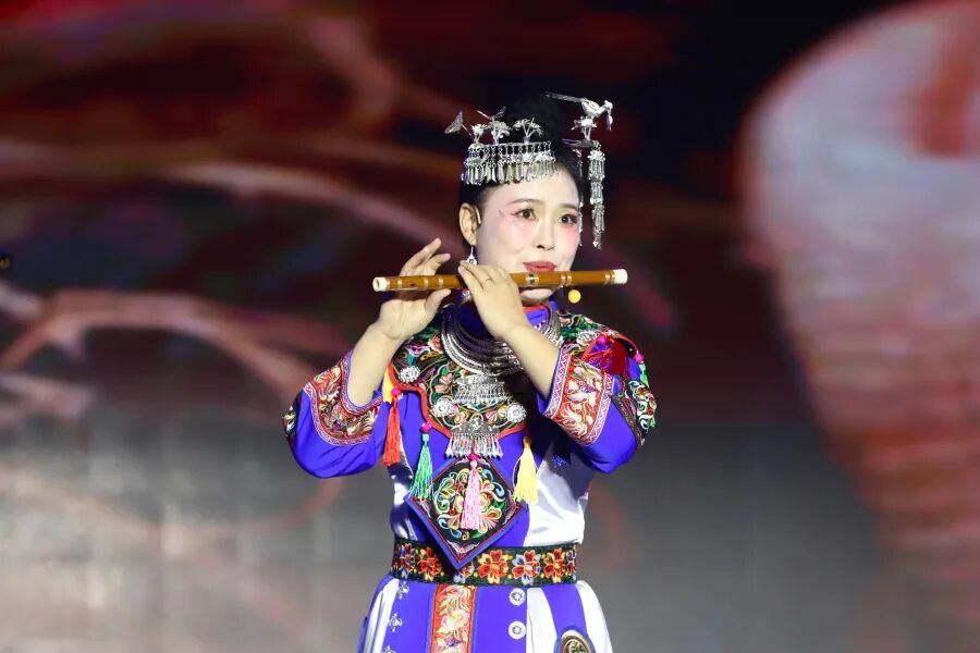 “一段历史承载一方水土记忆,一曲箫笛诉说一片家园热爱。”在观众的意犹未尽中,玉屏代表队携箫笛合奏《金色侗乡》登场。两根竹管齐鸣,清越的箫音与悠扬的笛声交织,时而如清泉流淌,时而如谷风轻吟,勾勒出侗寨金秋时节稻浪翻滚、瓜果飘香的丰收盛景。演奏者们身着侗族盛装,指尖在乐器上灵动跳跃,旋律中满是侗家人对生活的热爱、对来客的热忱。现场仿佛化作金色的侗寨田野,观众们在天籁之音中沉浸式感受着侗族同胞的幸福生活,掌声如潮,为这份纯粹的乡土深情喝彩。