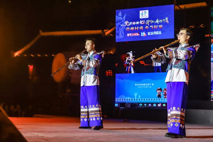当黔东的暮色染黄了文昌广场的飞檐,当晚风裹挟着箫笛的清韵与草木的芬芳,12月12日晚七点,“贵州村戏 乡当好耍”文旅主题活动第二季第七期如期赴约!“中国书法之乡”印江土家族苗族自治县,迎来了“中国箫笛之乡”玉屏侗族自治县的文化使者,两地以戏为媒、以艺会友,在四轮精彩绝伦的PK中,让土家族苗族文化的厚重底蕴与侗族风情的灵动雅致深度交融,共同谱写了一曲铸牢中华民族共同体意识的动人乐章。
