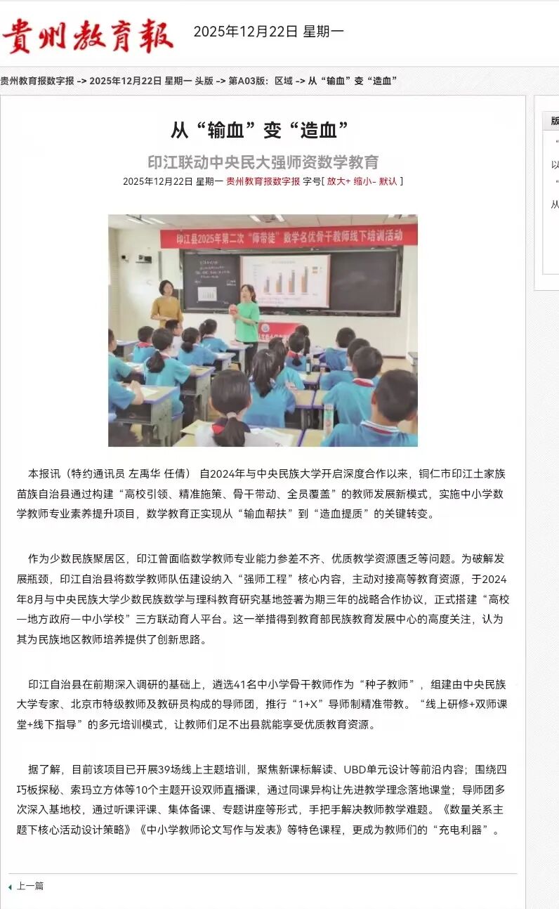 ▲12月22日,《贵州教育报》报道:从“输血”变“造血”印江联动中央民大强师资数学教育