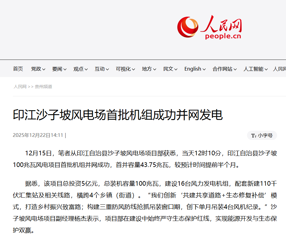 ▲12月22日,人民网贵州频道报道:印江沙子坡风电场首批机组成功并网发电